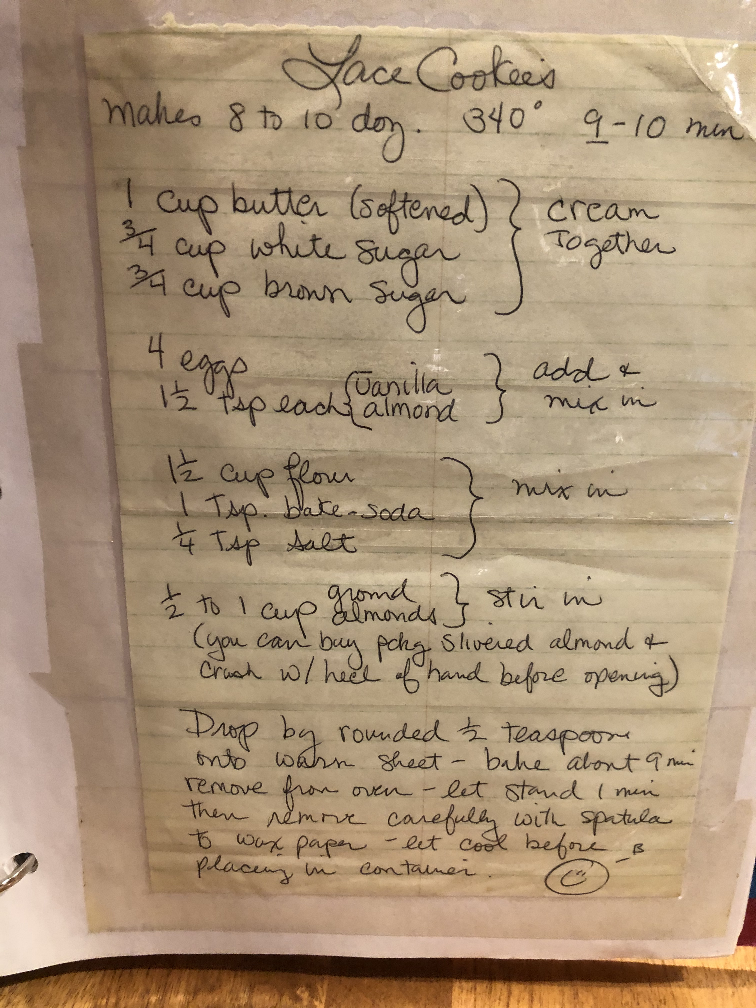 That being said one of the things I loved the best that she made was what she called "Lace Cookies", she would make them every year for my Farther before he passed away in 2003 and she had not made them since. I am not sure if that was on purpose, I just know I asked every year and it just never happened. Well a month into cleaning up the house moving things around, organizing and the things you generally do when you lose a family member, I realize that there was no recipe for lace cookies anyplace! I mean it wasn't an emergency but it definitely made me sad, so much so that I mentioned it to my sister when I went to her home on Christmas for dinner. As I was telling her this her eyes lit up as she responded that when she moved out of the house many years ago in New York that Mom in fact gave her the recipe, in a large binder of recipes that my Mom armed my sister with since now she was eating on her own, no one to cook for her and sometime down the line she would have a family of her own to cook for. Again, this is totally something my mother would do, trying to make sure she armed you with everything you needed to go out there in the world. So, my sister runs to the bookshelf near her kitchen and grabs this rather large loose-leaf binder, which she admitted she had not opened for many years. The binder consisted of many pages and as she plopped it down on the table in front of me, the binder opened up to exactly the page for the Lace cookie recipe! Prior to this we were just talking about how we missed her and how odd it felt just us two and her kids without Mom there and then wham RIGHT TO THE VERY RECIPE PAGE! BOOM! I mean you couldn't have done it a second time if you tried, and trust me we tried, a bunch. There was absolutely no rhyme or reason to this, no bookmark, it was just another recipe page in a large book of recipe pages that looked exactly the same. I kind of felt that was God letting me know my Mother was in good hands now and having her first Christmas in heaven and that we were OK! Amazing small moments where you know the Hand of God was in the mix! So, after sharing all that with you all I wish to also share her actual Lace Cookie recipe with you all in the hopes that if you knew her this story will give you a little smile and a bit more to remember her by. But if you did not have the pleasure of meeting her at the very least you can have a sampling of a bit of deliciousness to make you smile the way it made all of us! PS If anyone does make these, please send some photos to me via email of the adventure, before, during and after and I hope you find them as delicious as we all did! No matter how many Mom would make they sure never lasted long in our household! God bless and enjoy!